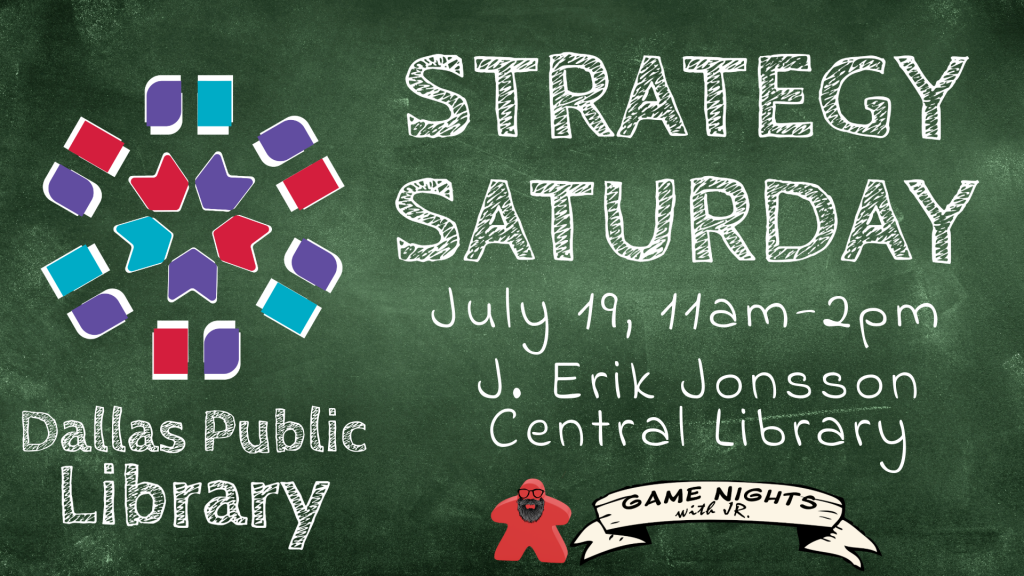 Date Saturday, July 19 Time 11am-2pm Location J. Erik Jonnson Central Library | Dallas Game Selection Deck Building, DraftingAquatica Read more WordLetter Jam Read more Action Points, Area Majority, Dice Rolling, Trick TakingARCS Read more Hand Management, RaceHEAT: Pedal to the Metal Read more Event Location StrategySaturday Join us for a night of fun games and new friends! Join the Club