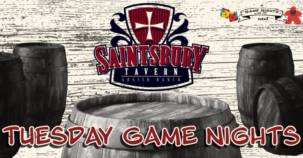Date Tuesday, June 24 Time 6pm-10pm Location Saintsbury Tavern | The Colony Game Selection Party, Social DeductionDeadwood 1876 Read more Eurogame, Resource Management, Set CollectionBlack Forest Read more Drafting, RaceFast Sloths Read more Dice Rolling, Press Your Luck, Set CollectionDeep Regrets Read more Drafting, Engine BuilderFurnace Read more Set Collection, Worker PlacementTenpenny Parks Read more Event Location Tuesday in The Colony Join us for a night of fun games and new friends! Join the Club