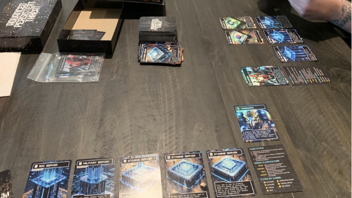 To begin, players take a Staging Server, Small DDOS Zero-Day card, and reference card and place them on the table in front of them. This is your Network into which you will be playing cards