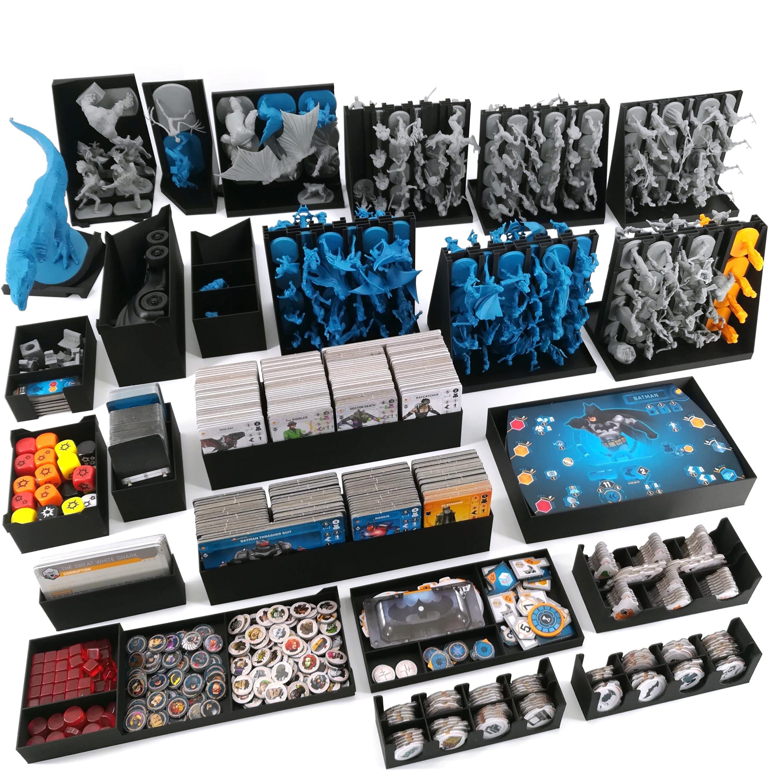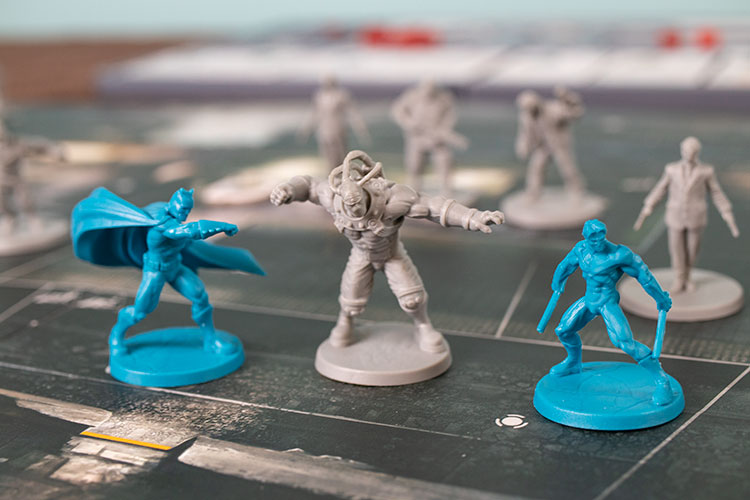 In Batman: Gotham City Chronicles, one villain faces off against a team of heroes in one of multiple scenarios. Each hero has their own character, and they control this character by spending energy to perform actions (such as Melee and Ranged attacks, defusing bombs…) recovering more or less energy at the beginning of their turn depending on their stance. If the hero gets damaged, energy moves to a wound area, and if they lose all of their energy, then they’re out of action for a while to recover their strength. Each hero has differing strengths for their abilities, and these strengths are represented by colored dice with different values; the more energy a hero spends on an ability, the more dice of that color they can roll.