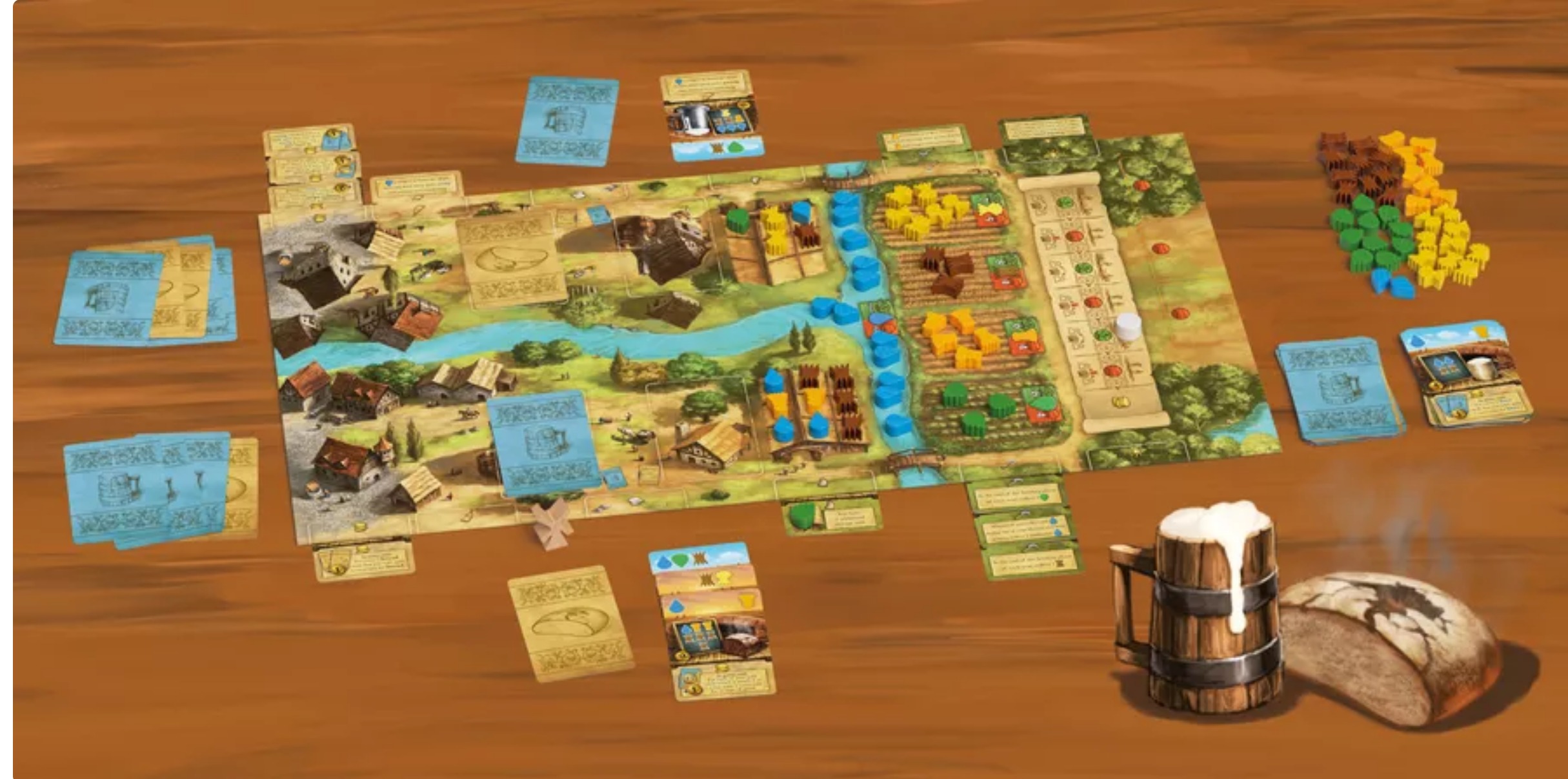 Each of you represents one of these villages. Over the course of six years – which alternate between fruitful and dry – you must harmonize your duties of harvesting and storing resources, producing beer and bread, selling them for coins and upgrading your facilities.