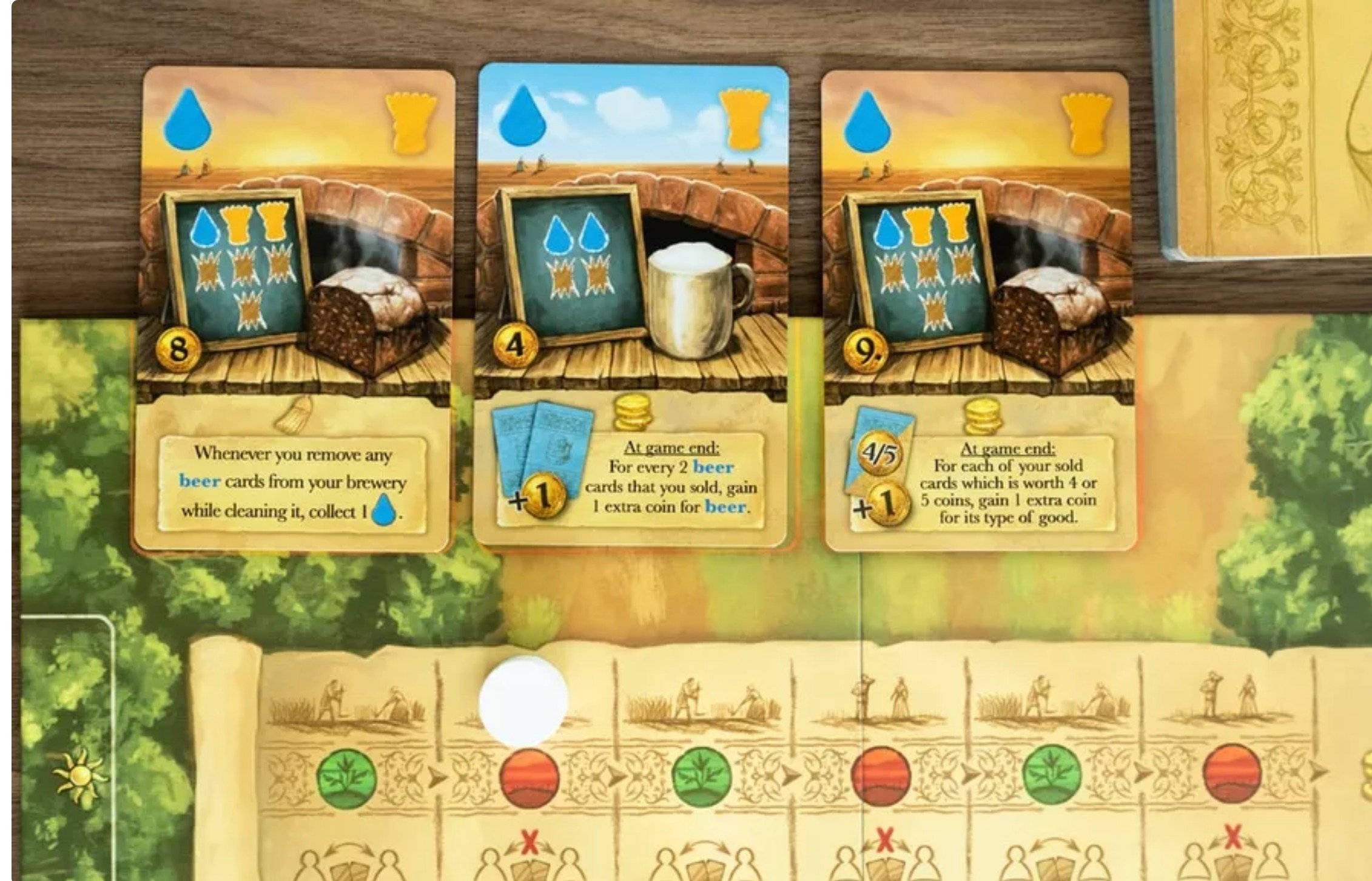 However, in order to win, you must maintain the balance between your baked and liquid goods. Because, after the sixth year, you only score the coins collected from the type of good – beer or bread – for which you earned less. The village with the higher score wins.