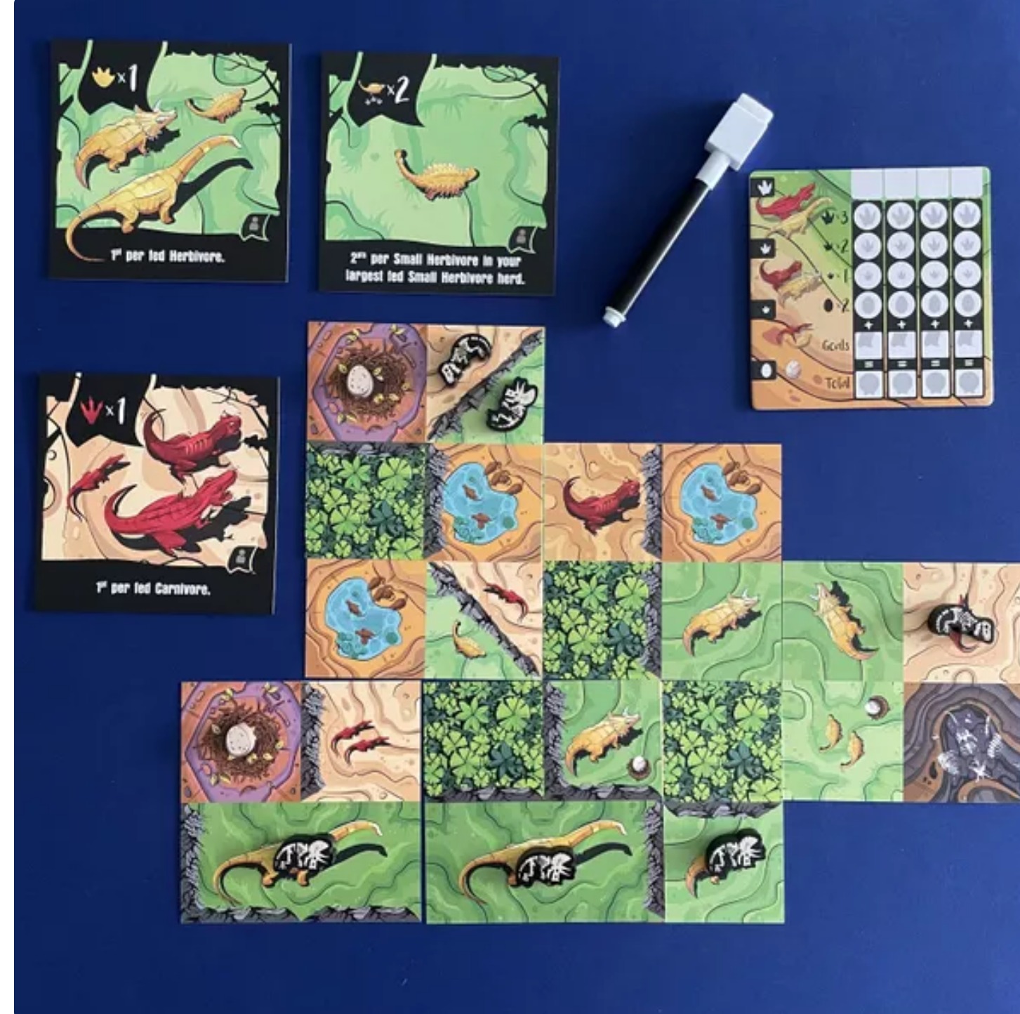 Gameplay involves dual rows of goal tiles and dino tiles, and each turn players select one tile to add to their personal arrangement. Goal tiles stay off to the side for endgame scoring, and dino tiles are arranged in front of each player. Dino tiles include three sizes each of herbivores and carnivores. Each tile must overlap previous ones, either on top of a quarter tile, half tile, or even a whole tile, ensuring that any covered cinos are completely hidden.