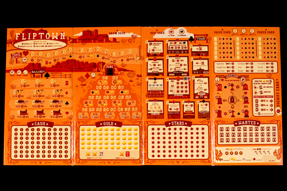 Fliptown is a flip-and-write game in which you are trying to earn stars by exploring a wild west town. The game uses a standard poker deck to drive an open world-style of game play, along with dry erase boards or print-and-play sheets that serves as each player’s map.
