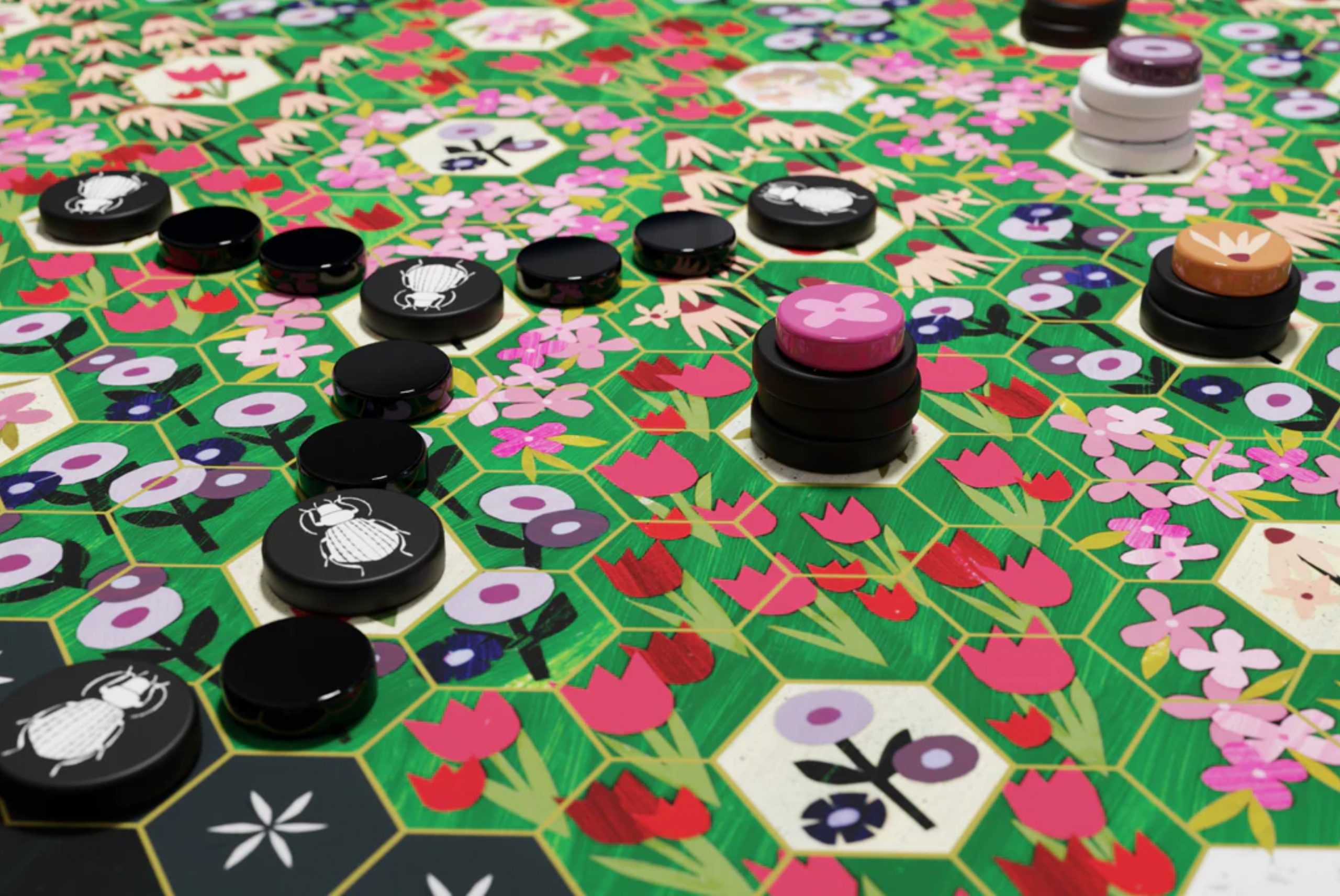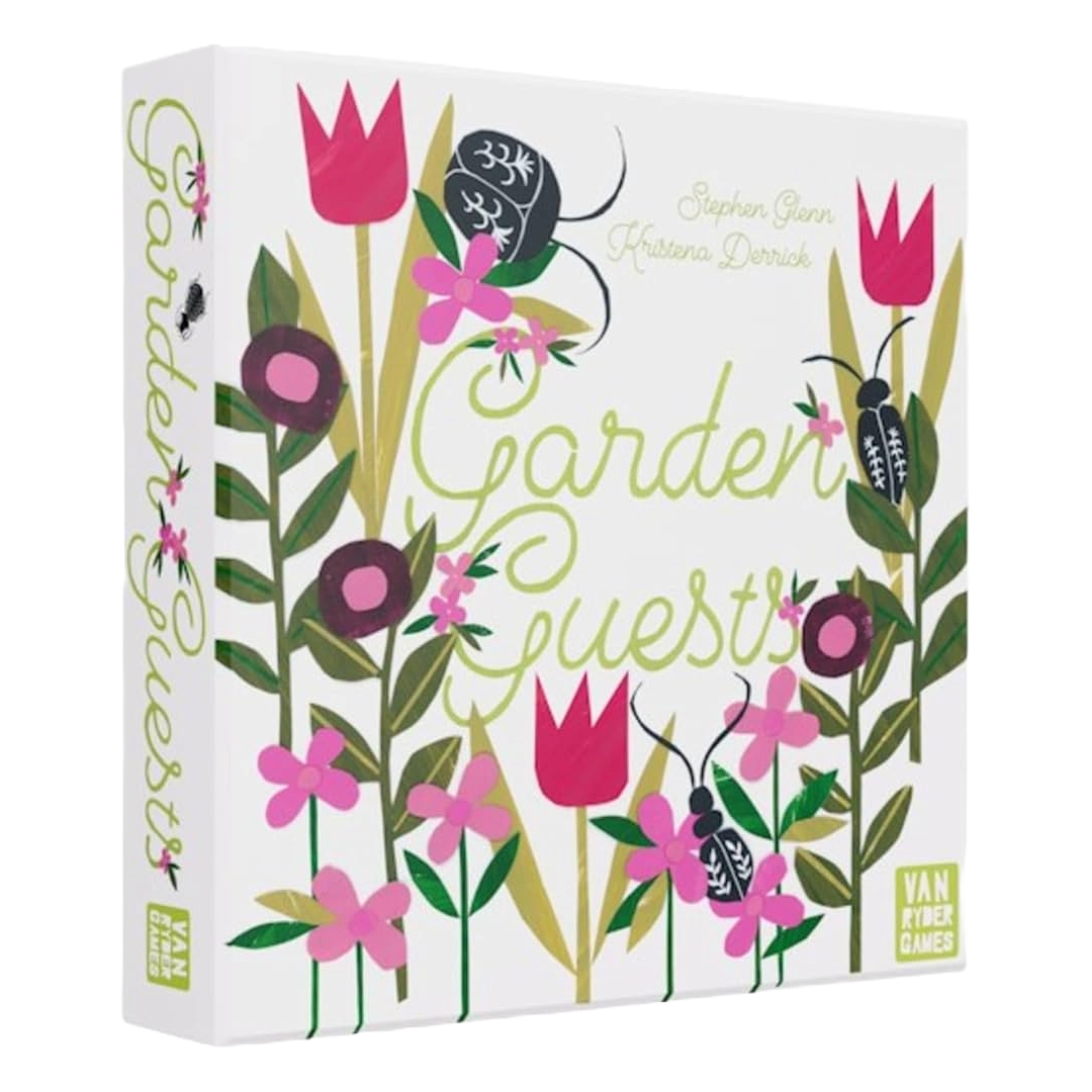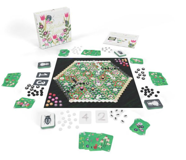 In Garden Guests, players compete to form a continuous path across a garden board that features beautiful paper cut art.