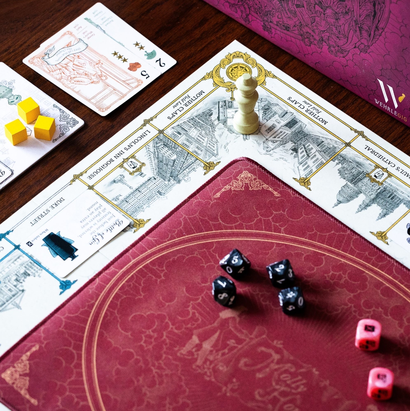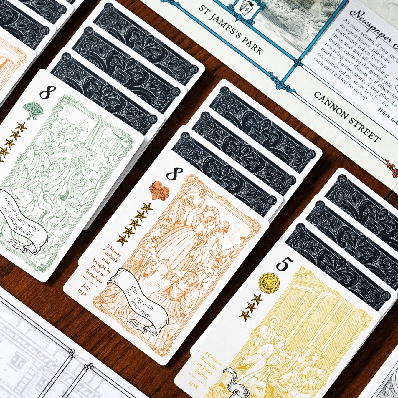 Players draft hands of vice cards representing the different gestures, desires, and encounters that were frowned upon by the Society for the Reformation of Manners, a citizen group that sought to stamp out any behavior it deemed deviant in late 17th and early 18th century London. These cards allow players to host festivities with the help of their fellow mollies and create joy. But, those same cards can also lead players to be arrested and to the ultimate ruin of the molly house.