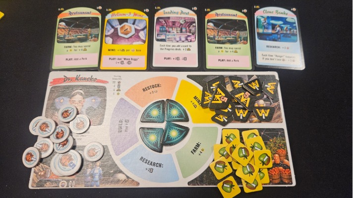 Moon Colony Bloodbath is an engine-building, engine-losing tableau game, with a shared deck the players build that makes things happen, many of them bad things that kill people in your moon colony, but some positive, and some that let you build up.