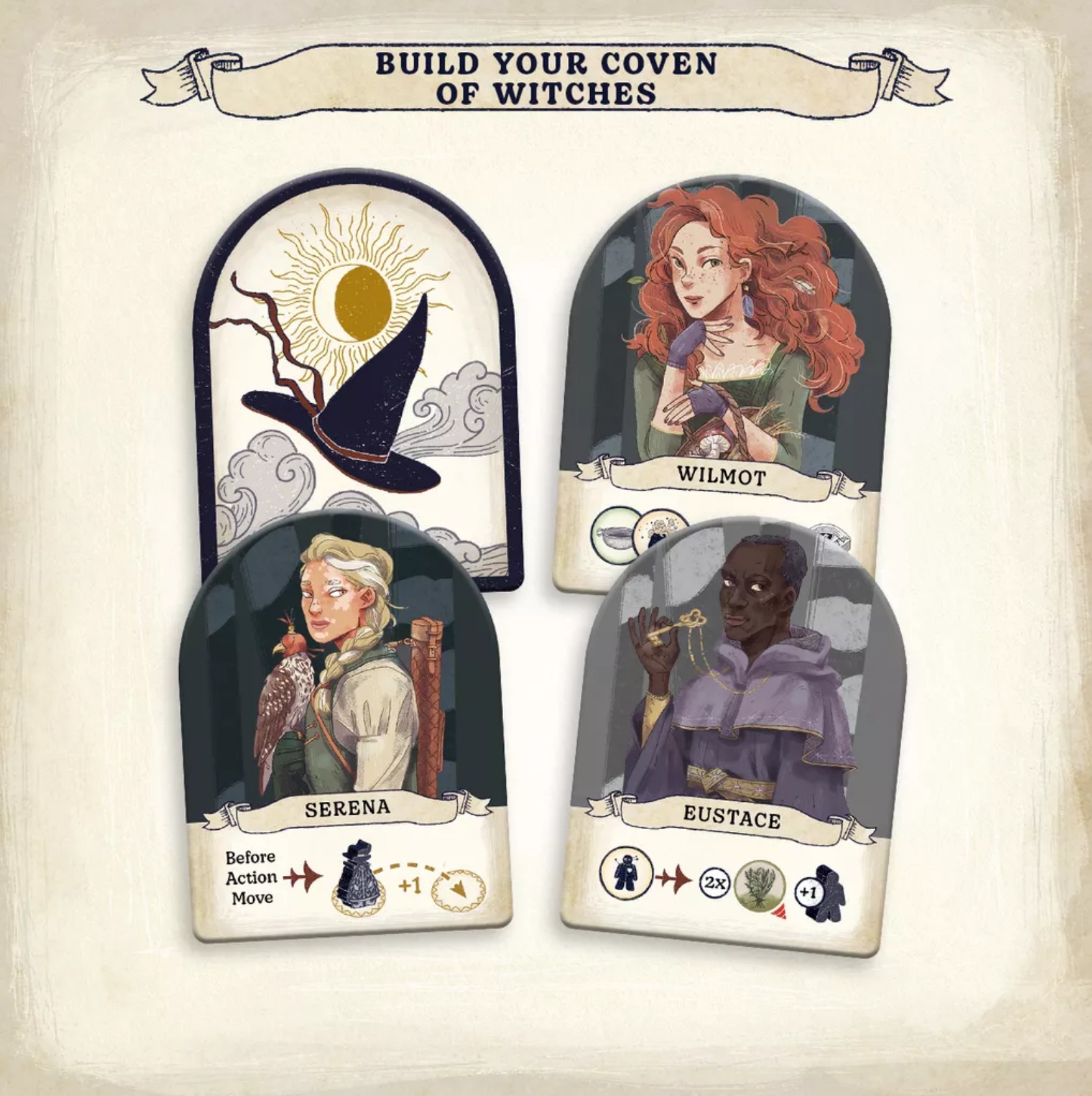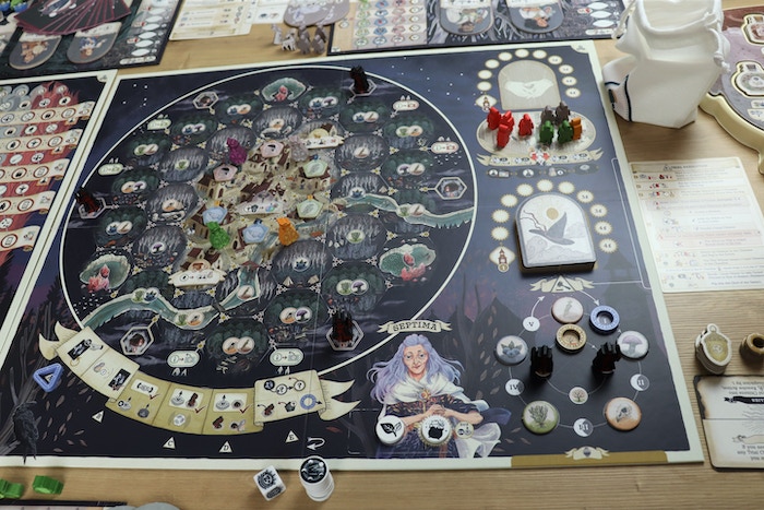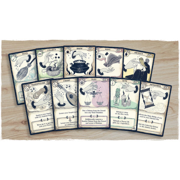 Simultaneous action selection with positive player interaction: Septima’s central mechanism revolves around the simultaneous, secret selection of one of nine Action cards each turn: Move, Collect, Brew, Heal, Recruit, Plea, Chant, Rite and Remember. Each Action gets a powerful bonus if it is chosen by multiple players, but performing them together also raises suspicion in the townsfolk and attracts the attention of the Witch Hunters. Decisions of when to do a shared action (and who to do it with) adds a fresh, semi-cooperative touch to a competitive game, and lots of player interaction.