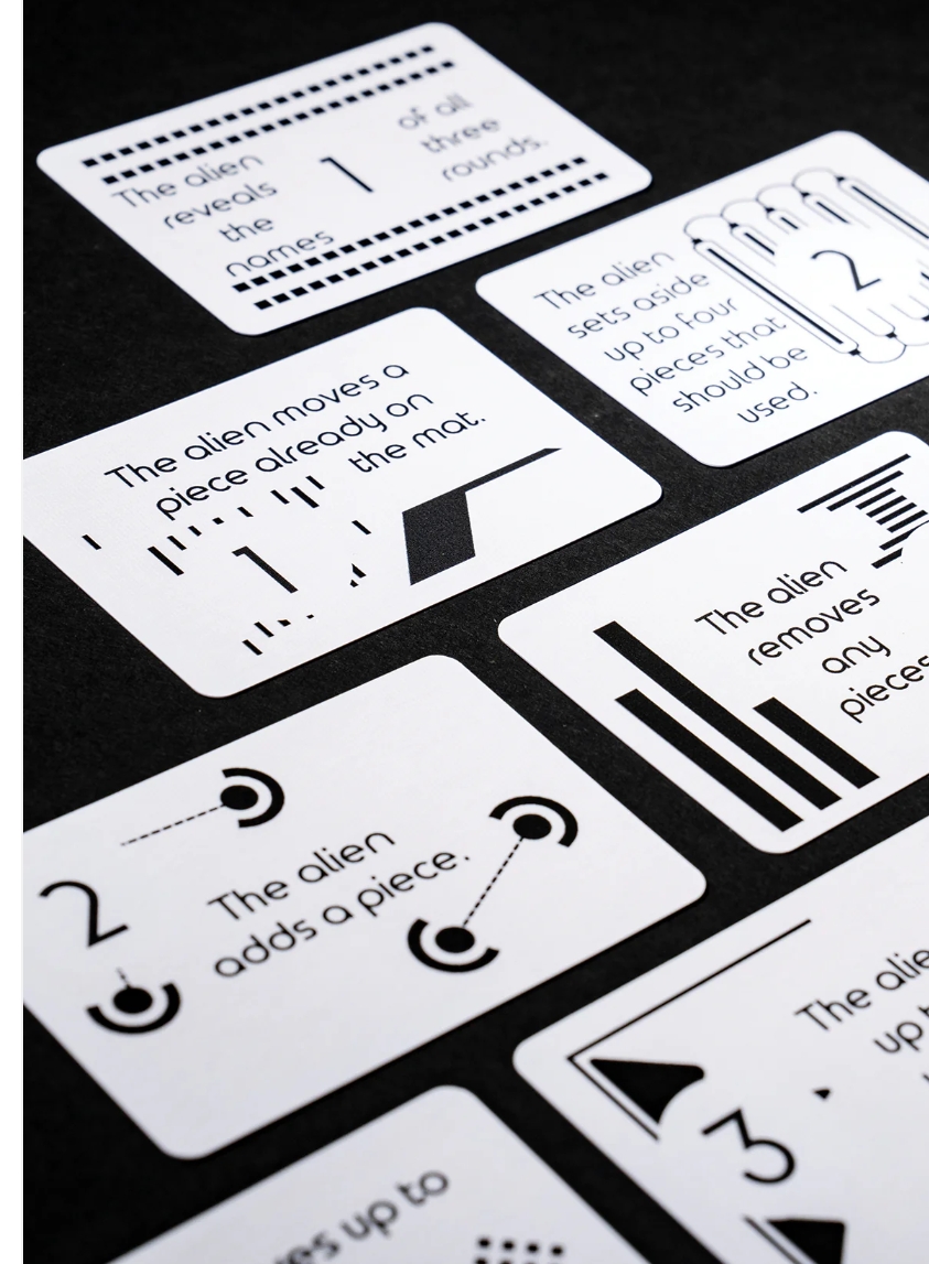 On a turn, the Experts arrange black and white pieces on a mat to represent a graphical signal, discussing and debating how and what to send. Once finished, the Alien then replies by using pre-set rules only they can see to add, remove, and adjust the signal, both to be helpful and to try to reach an agreement, which is represented by a pre-set signal that they are trying to achieve with their limited response capabilities. As the Experts analyze and understand the Alien, they can use limited guesses and a few hint-like abilities to discover which signal they can send that will result in agreement. The Alien even has a little leeway in how they respond; after all, they want to be understood.