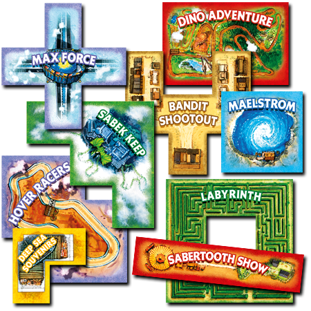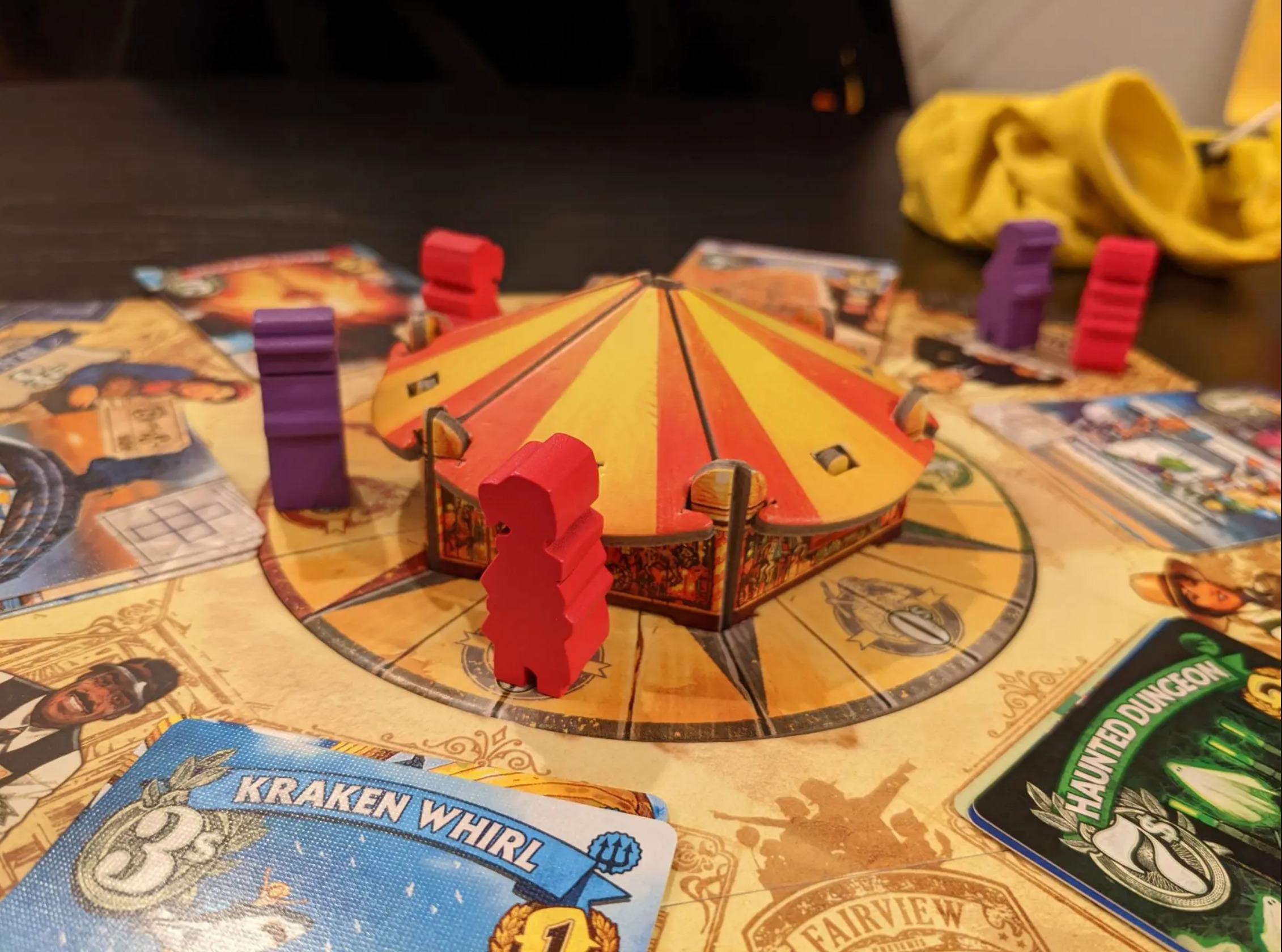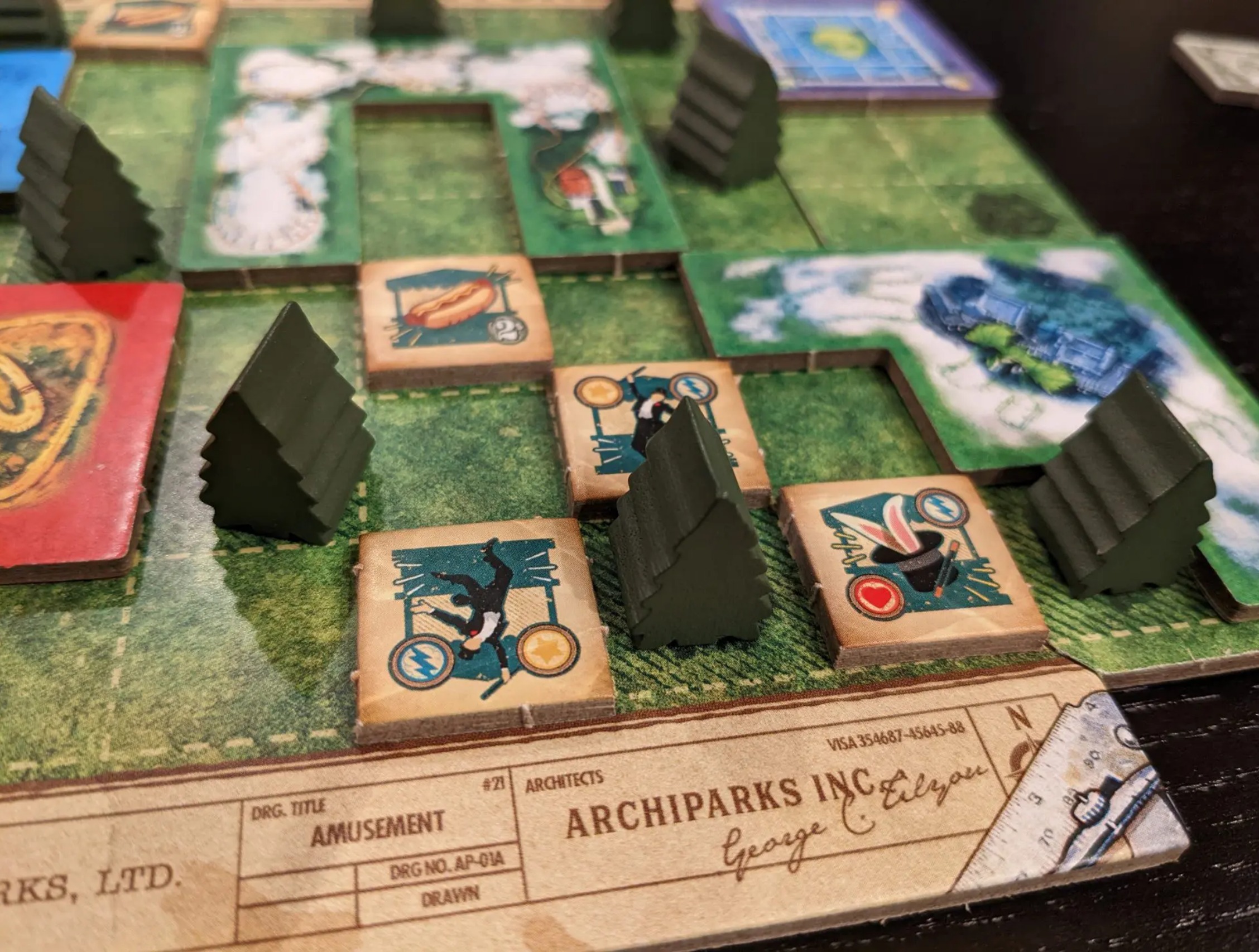 A game of Tenpenny Parks is played over five rounds, called months. Each month players take turns placing workers on the gameboard to take actions like removing trees, building concessions and attractions, and buying more property in order to make their growing theme parks as attractive to visiting people (VP tokens) as possible. At the end of each month, rewards are given to the player with the fairground that best exemplifies certain raw emotions, and after five months the player with the most VP tokens wins!