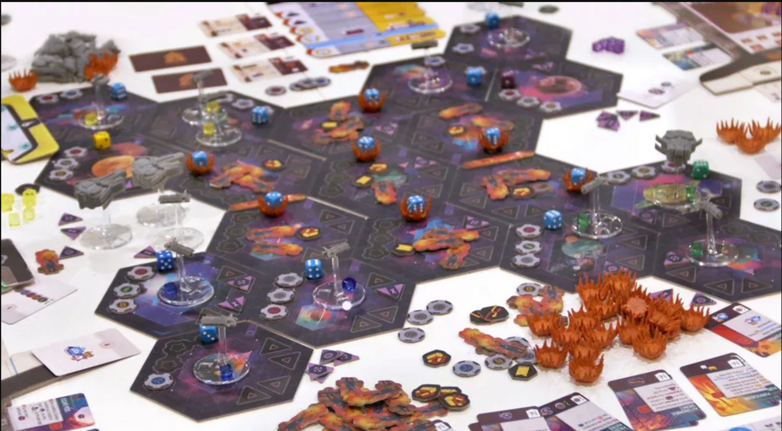 As the leader of a defiant Great House, you play through three cycles, each with a game-altering galactic event, a new scoring condition, and a set number of focus cards that can be played. Focus card decisions and sequencing is the centerpiece of the gameplay. By selecting two of their three impactful actions as you play them, you develop and improve techs; advance on your three house-specific civilization tracks; manage your sectors’ infrastructure, population, and production; and conquer new sectors with up to five different types of space fleets. Space battles are fought either against the Voidborn’s infected forces (which are present as neutral opponents even in the competitive mode) or against other players. Instead of relying on the luck of a die roll, battles in Voidfall are fully deterministic and reward careful preparation and outsmarting your opponents.