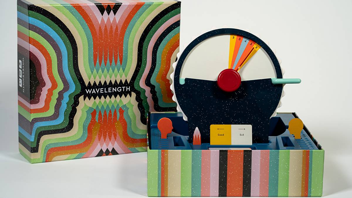 Wavelength is a social guessing game in which two teams compete to read each other’s minds. Teams take turns rotating a dial to where they think a hidden bullseye is located on a spectrum. One of the players on your team — the Psychic — knows exactly where the bullseye is, and draws a card with a pair of binaries on it (such as: Job – Career, Rough – Smooth, Fantasy – Sci-Fi, Sad Song – Happy Song, etc). The Psychic must then provide a clue that is *conceptually* where the bullseye is located between those two binaries.